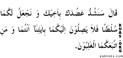 *QAALA SANASHUDDU A’Z’UDAKA BI-AKHEEKA WA NAJ-A’LU LAKUMAA SULT’AANAN FALAA YAS’ILOONA ILAYKUMAA BI-AAYAATINAAA ANTUMAA WA MANIT TABA-A’KUMAL GHAALIBOON