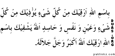 *BISMISLLAAHI ARQEEKA/ARQEEKI MIN KULLI SHAY-IN YOO-D’EEKA/YOO - D’EEKI MIN KULLI SHAY-IN WA A’YNIN WA NAFSIN WA H’AASIDIN ALLAAHU YASHFEEKA / YASHFEEKI BISMILLAAHI ARQEEKA / ARQEEKI ALLAAHU AKBARU WA JALLA JALAALUHOO *