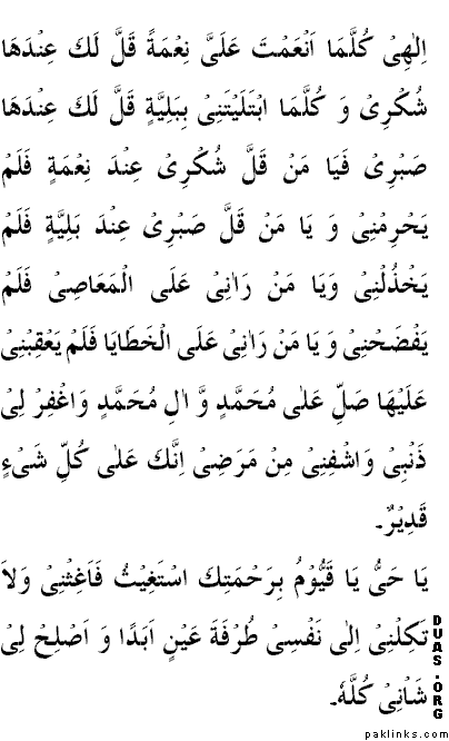***ILAAHEE KULLAMAA AN-AMTA A’LAYYA NI-MATAN QALLA LAKA I’NDAHAA SHUKREE WA KULLAMAB-TALAYTANEE BI-BALIYYATIN QALLA LAKA I’NDAHAA S’ABREE FAYAA MAN QALLA SHUKREE I’NDA NI’-MATIN FALAM YAH’RIMNEE WA YAA MAN QALLA S’ABREE I’NDA BALIYYATIN FALAM YAKHD’ULNEE WA YAA MAN RAANEE A’LAL MA-A’AS’EE FALAM YAFZ’AH’NEE WA YAA MAN RAANEE A’LAL KHAT’AAYAA FALAM YA’QIBNEE A’LAYHAA S’ALLI A’LAA MUH’AMMADIN WA AALI MUH’AMMADIN WAGHFIR LEE D’ANBEE WASHFINEE MIN MARAZ’EE INNAKA A’LAA KULLI SHAY-IN QADEER