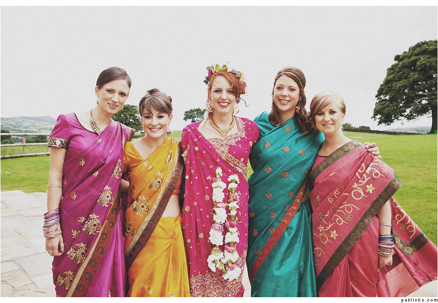 To be honest, I really think white girls look the best in white/beige/pale pink or other similar colors. Dark jewel tones that we desis’s love and rock just doesn’t work with white girls skin tones…especially if she’s “very pale”. I think you should definitely ask the bride herself if there is a specific color she would like or a color that she thinks she looks great in. Otherwise, its safe to stick with white/off white/beige type colors with tons of crystal work…and MAYBE a slight hint of a COOL TONED color.
