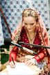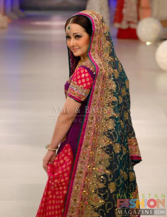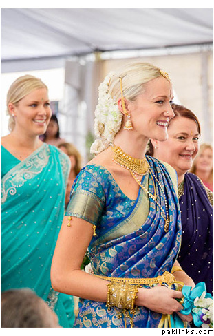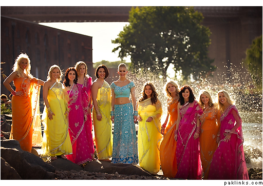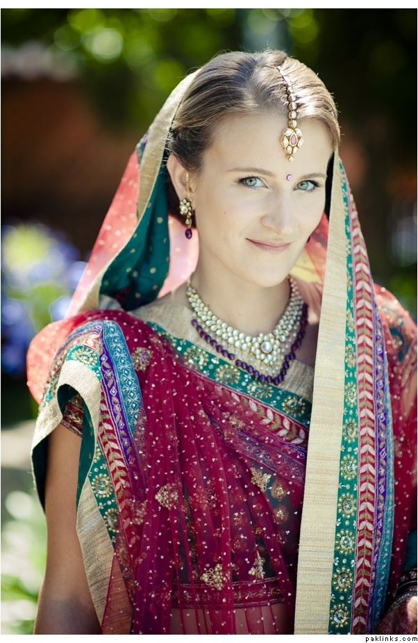 I have a friend who wants me to make a pakistani styled walima bridal dress for her gori bhabi-to-be. She told she is very pale with blonde. Can we put up some pictures of non-desi brides in desi bridals for an idea what would look best colour and style-wise ?