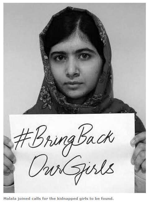 I think when 276 girls are kidnapped it is entirely appropriate to protest their kidnapping. With play cards that say bring back our girls. I don’t believe Malala is for murder of young boys.
