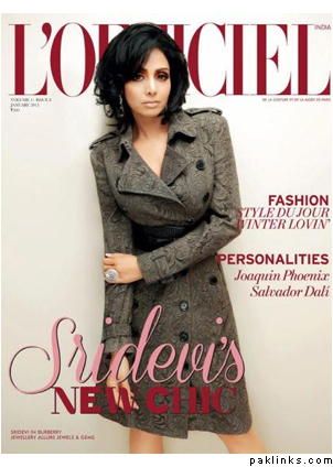 Evergreen beauty Sridevi graces the cover of L’Officiel India January issue 2013 wearing a Burberry London belted lace trench. Who do you like better in Burberry? I prefer Sridevi over Vidya.