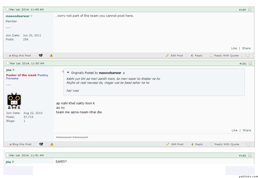 239 posts yani 238 ashaar posts huwe hain boys thread main 11: 59 (AM GS Time). iss hisaab se total marks 238 x2= 476 bunte hain. jo mistakes agree hui hain unke marks deduct karen aur points bataen. boys are leading on first day ![]()