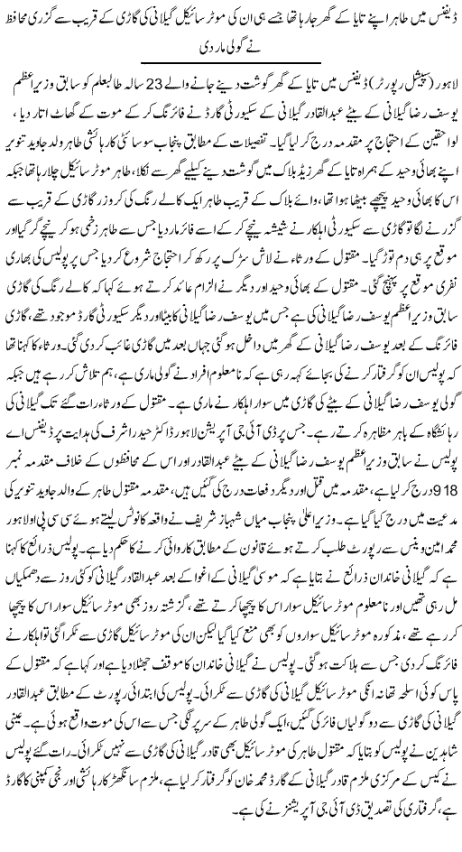 اور آج لاہور کے ڈیفنس کے علاقے میں اس کے بیٹے کی گاڑی سے ایک موٹرسائکل سوار نوجوان کی ٹکر ہوگی اور اس کے گارڈز نے فائرنگ کرکے اسے ہلاک کرڈالا۔ پولیس نے عبدالقادر گیلانی کے خلاف ایف آئی آر کاٹ لی ھے۔