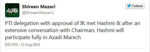 My dad knows Javed Hashmi, he's a very nice man, but bit too old school (Tony Benn like) politician for PTI's always charged up and jumpy camp. I hope he stays with the party, but it's okay, if he doesn't want to join the march. After all, this march is for democracy, and everyone in democracy has the right to no.
