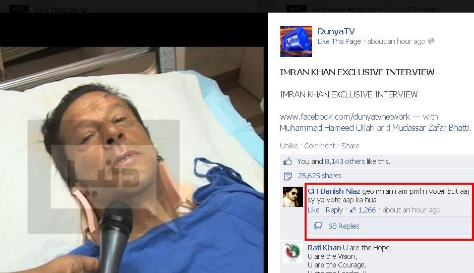 I talked to Imran few minutes before. He said I will carry on my campaign no matter doctors allow me or not. I will fight for my Nation till last drop of blood. - Haroon Rasheed