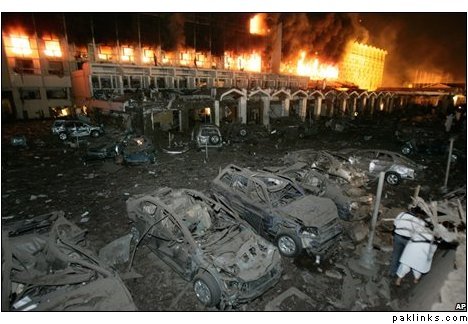 Sentiments apart but blast of this scale and strength in such a high security zone is an indication of something else...that is, the perpetrators had done elaborate planning...one should not forget Zaradari will be visiting US in a couple of days where he would meet Bush...Robert Gates US defense secretary had said a week ago that ISI would have to be reformed...And sometimes back, there was this assasination attempt on Yousaf Gilani...
