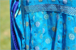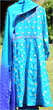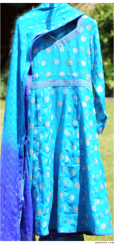 Turquoise Anarkali Anarkali: Chiffon Banarsi (flowers are in blue, pink and bronze), fully lined with hidden back zip. Churidaar: Blue Silk to match ends of duputta. Duputta: Chiffon Banarsi dyed turquoise in the middle and blue at the ends. Price:Rs.7,500 £58; $93; today’s rates]