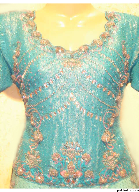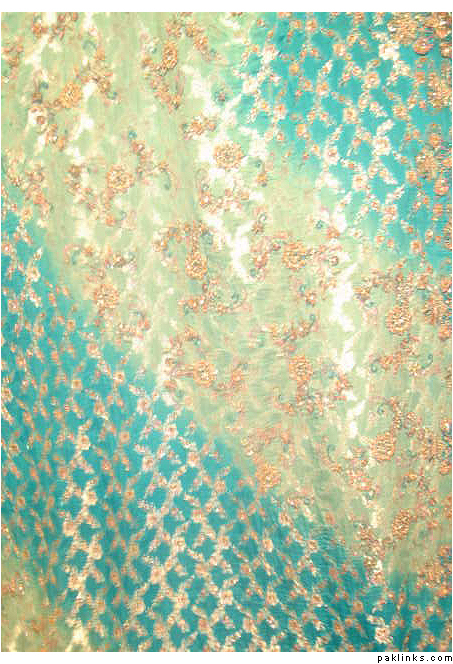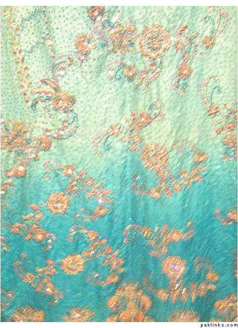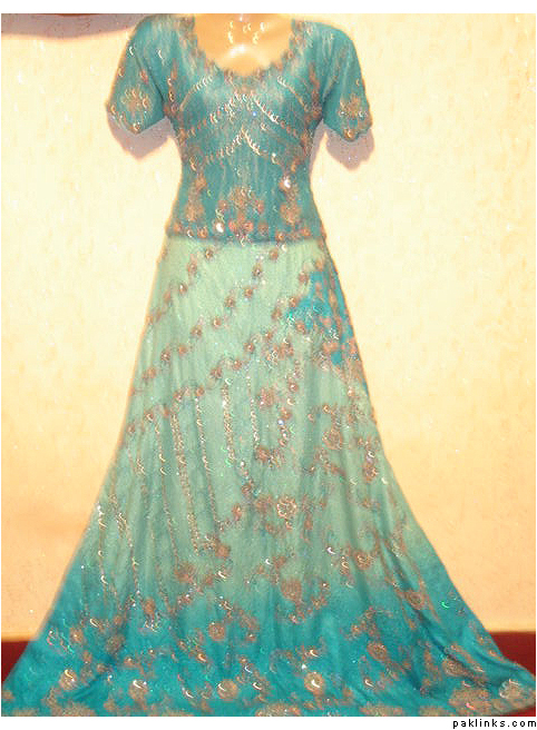 Two Tone Sea Green Bridal Lengha Shirt: Kundan Zari (type of banarsi) Lengha: Jamawar, Worked all over Duputta: Banarsi Chiffon, Worked all over Kaam: Fine Dabka, Beads, Sequins, Kundan, Diamantes, Some Thread-work Price: Rs.80,000** £587, $969usd, 676EUR ; on 23/08/09] **