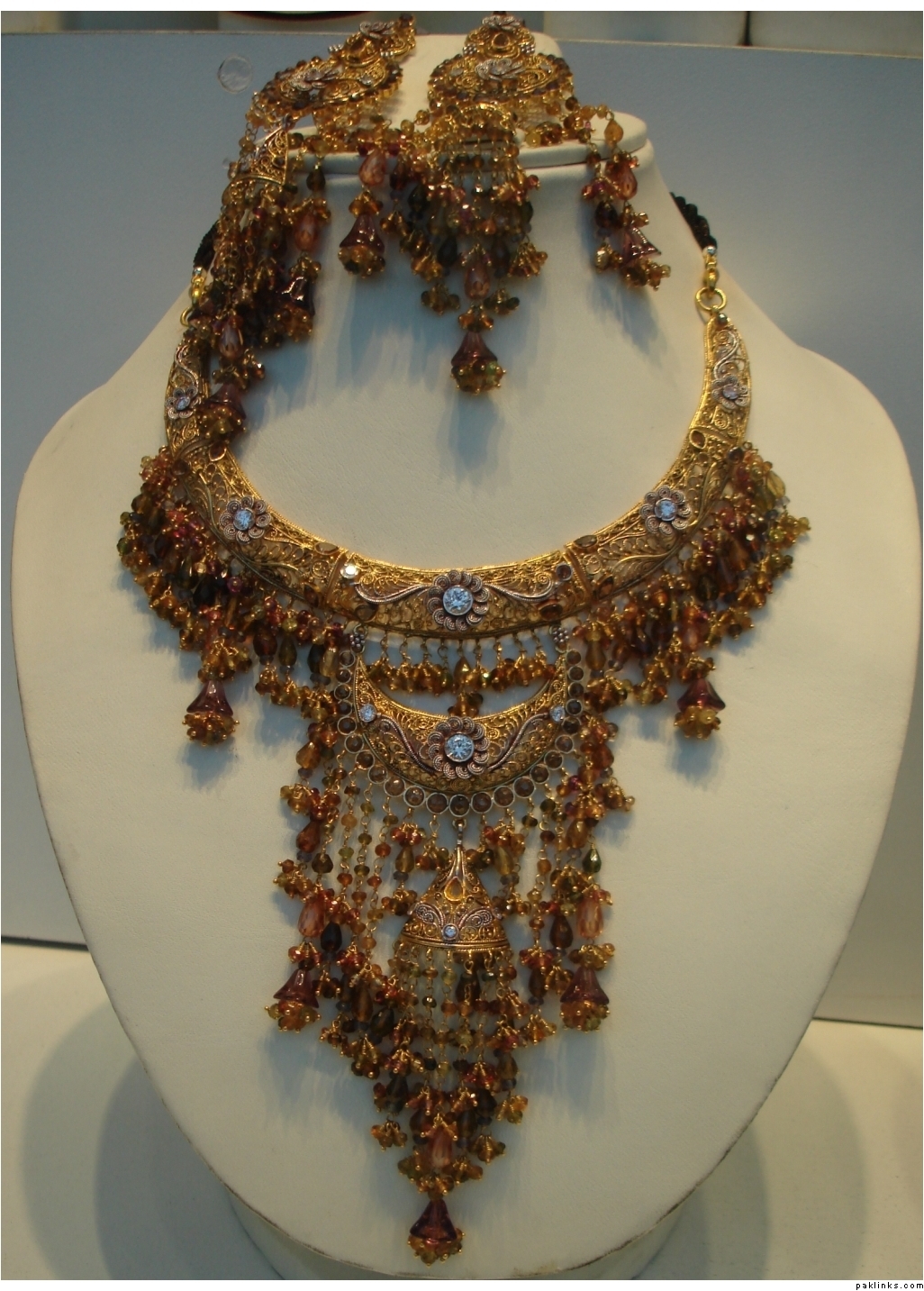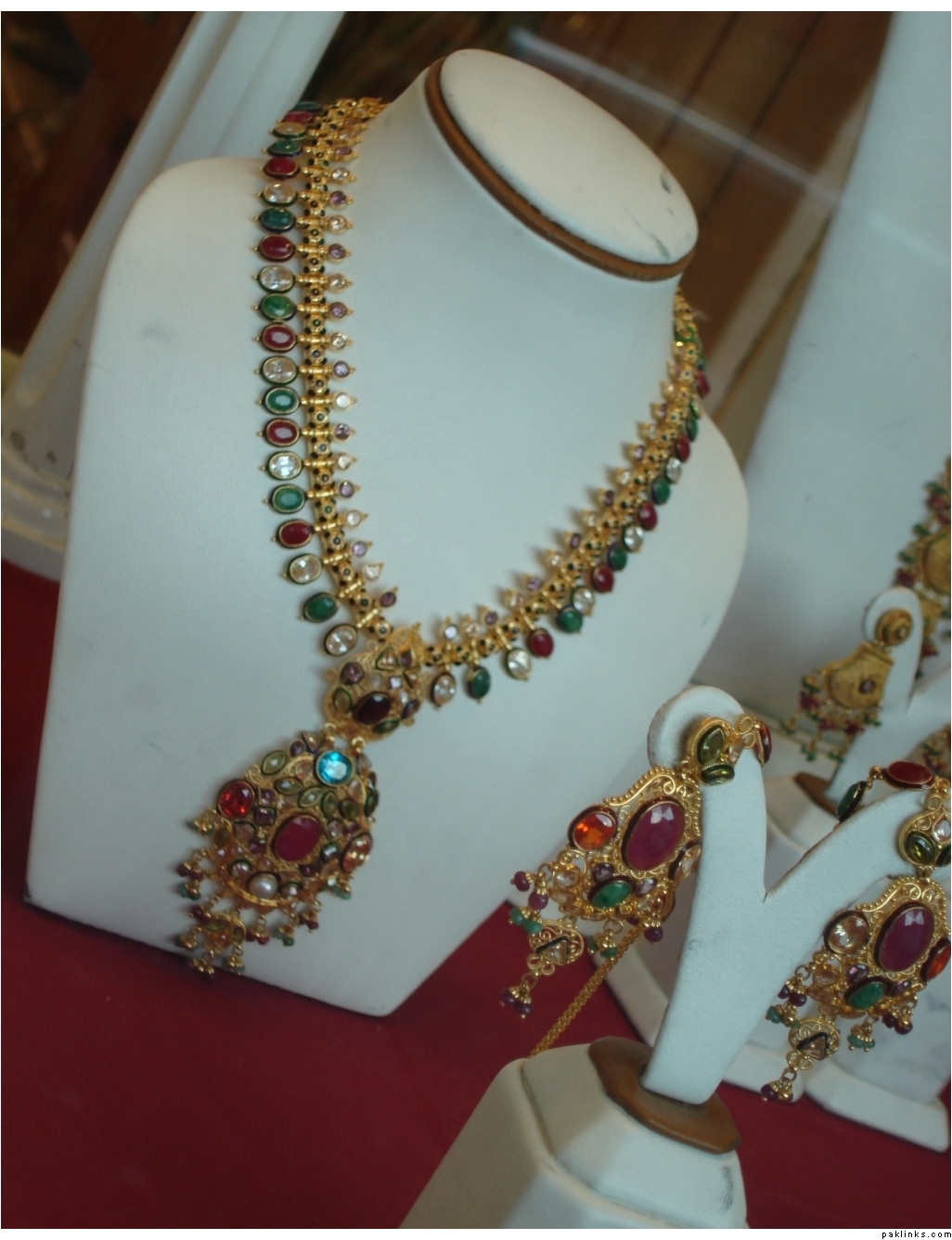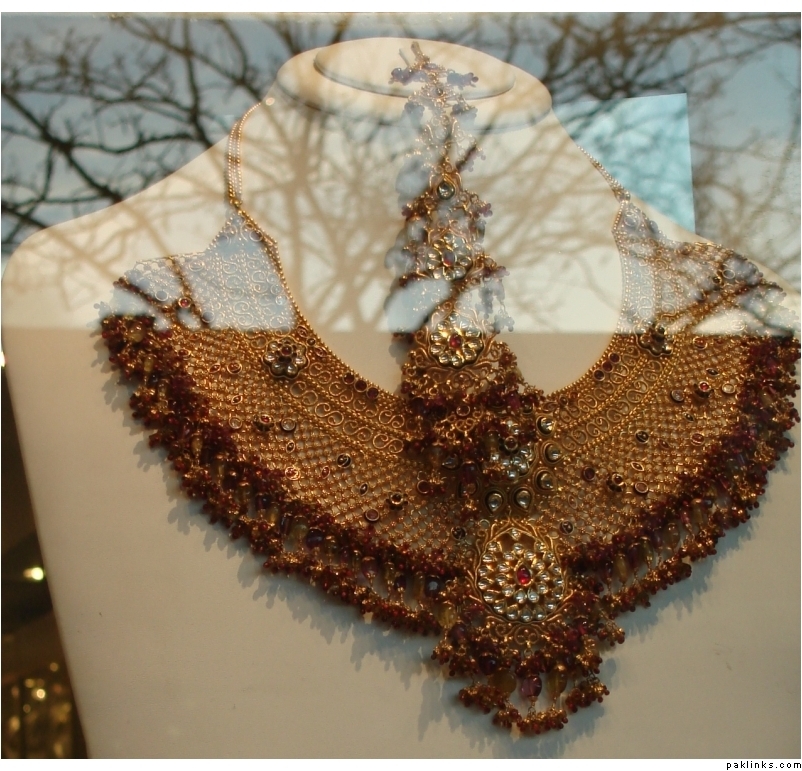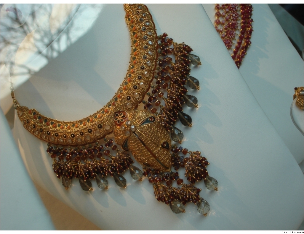 this is one colour of my shaadi lehnga for which i need jewellery…the other colour is red…but as most of the lehnga is red and only lehnge ka niiche waala hissa teapink hai aur dupatte me thoda sa teapink hai…i was thinking to go with gold n teapink?..or has someone else a better option??..need help..thx..if u could post pix of jewellery which could go with it would be very nice..but i dont like these haars with the drops hanging under..
