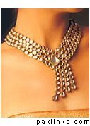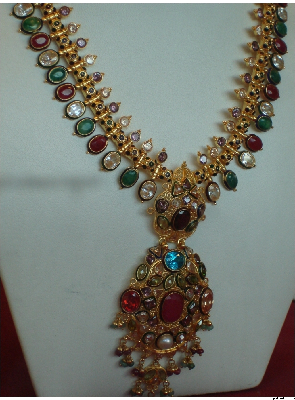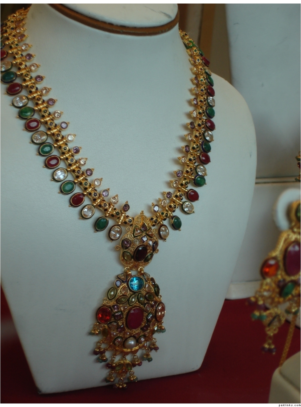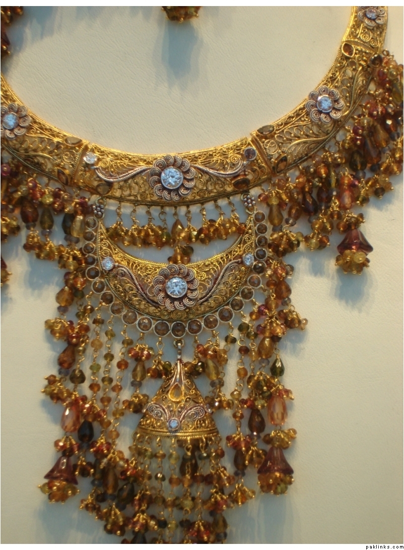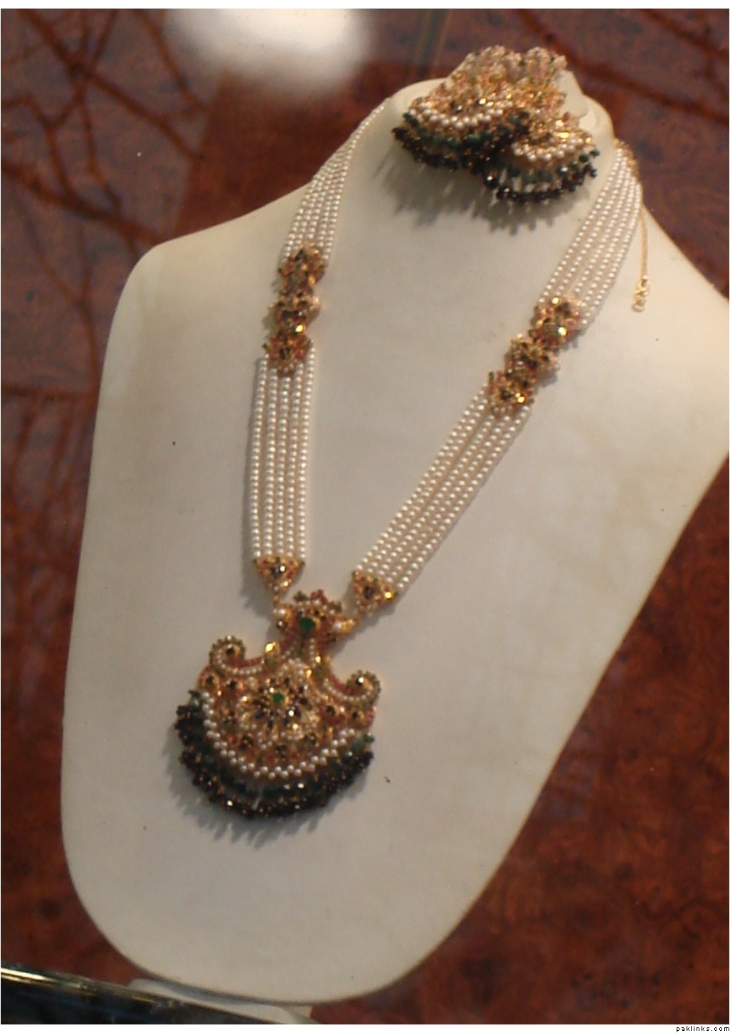 this is one colour of my shaadi lehnga for which i need jewellery…the other colour is red…but as most of the lehnga is red and only lehnge ka niiche waala hissa teapink hai aur dupatte me thoda sa teapink hai…i was thinking to go with gold n teapink?..or has someone else a better option??..need help..thx..if u could post pix of jewellery which could go with it would be very nice..but i dont like these haars with the drops hanging under..