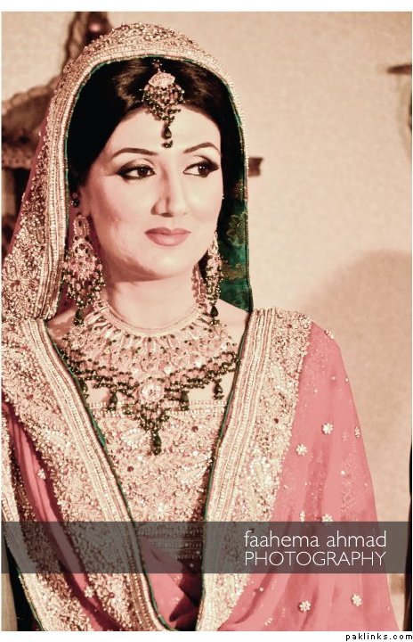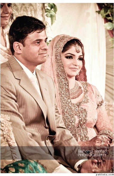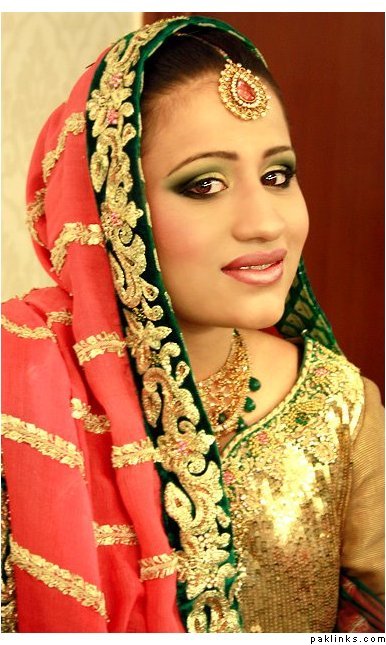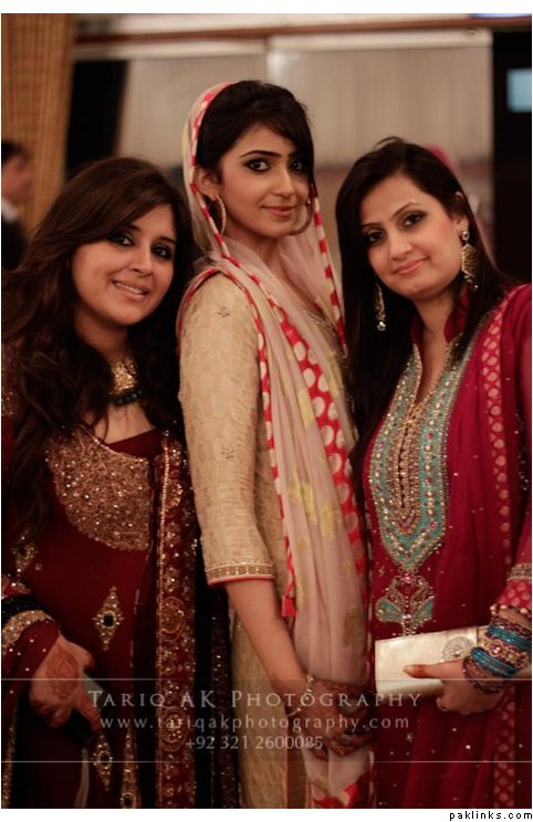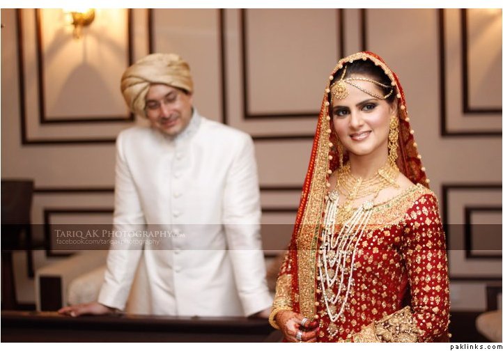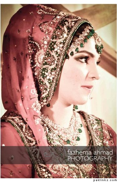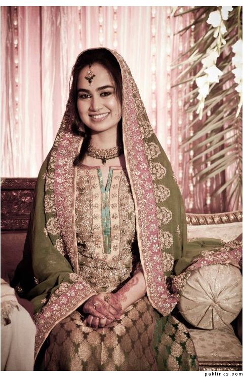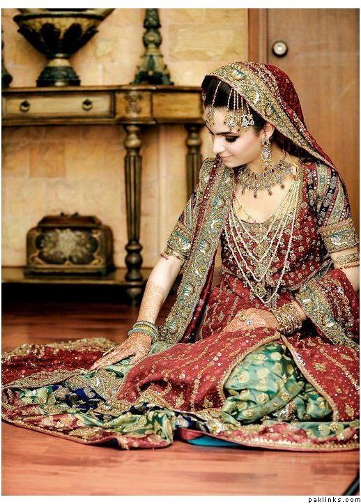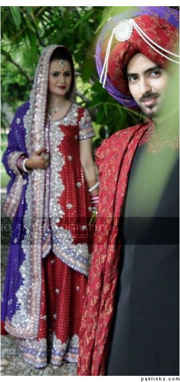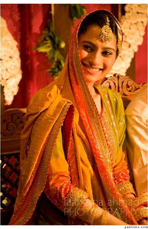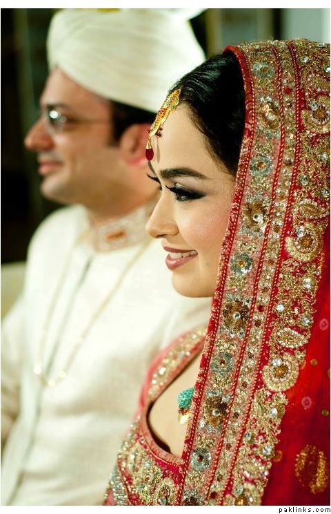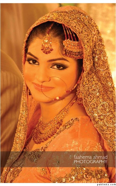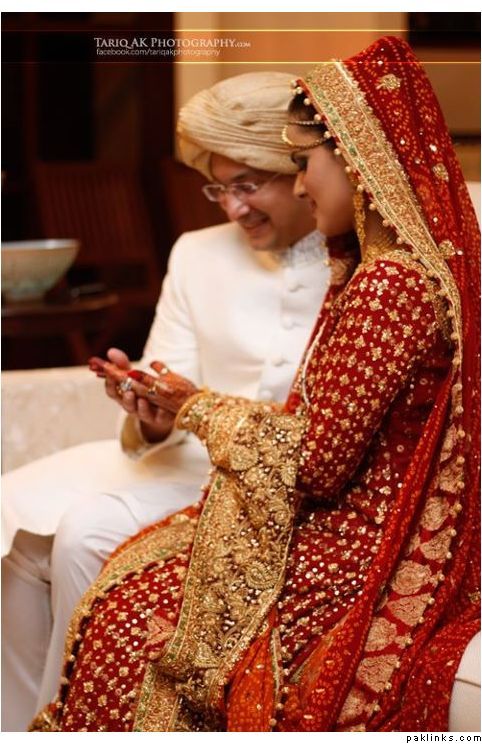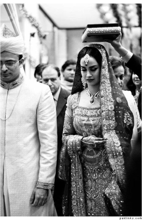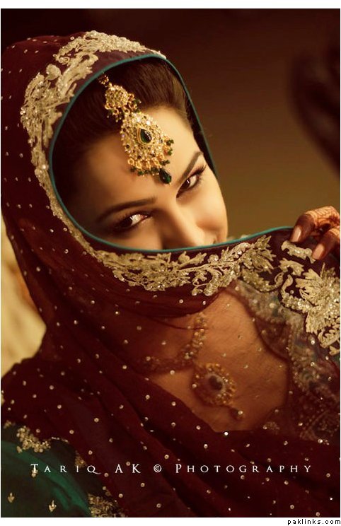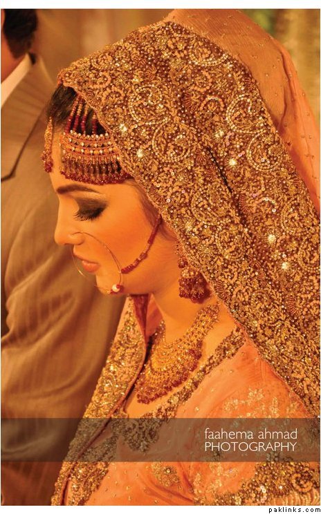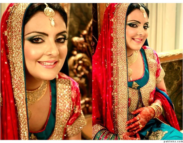 Hehehe - good spot I Queue. I played a game of spot the difference and found one: the colour of the second shirt underneath the kameez is green in the sitting down picture and maroon in the real bride. Also, the real bride has a dark blue and cyan border, whereas the model has a dark blue and green border. Very beautiful dress though, I have to say - I love the neck detail thing. Who’s the designer?