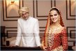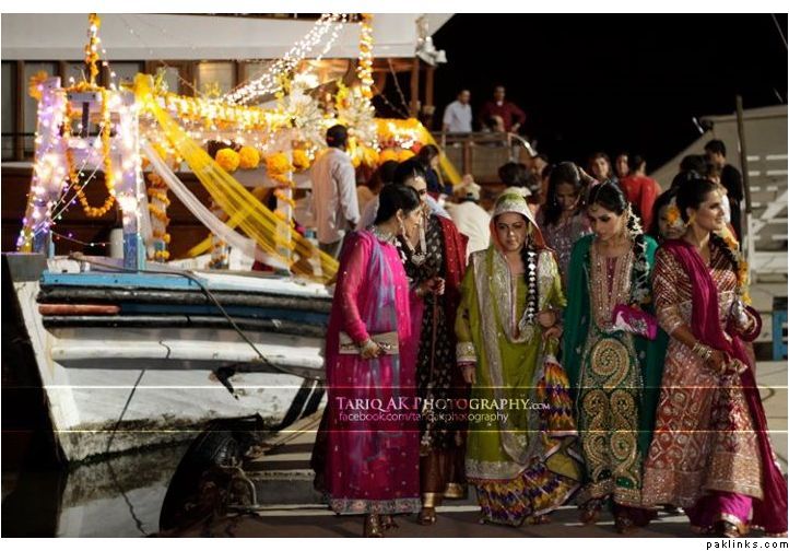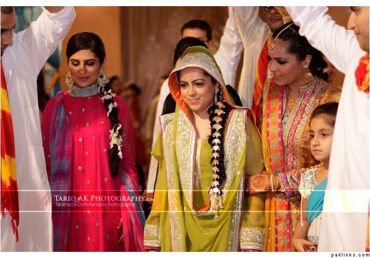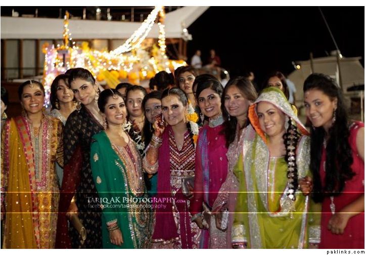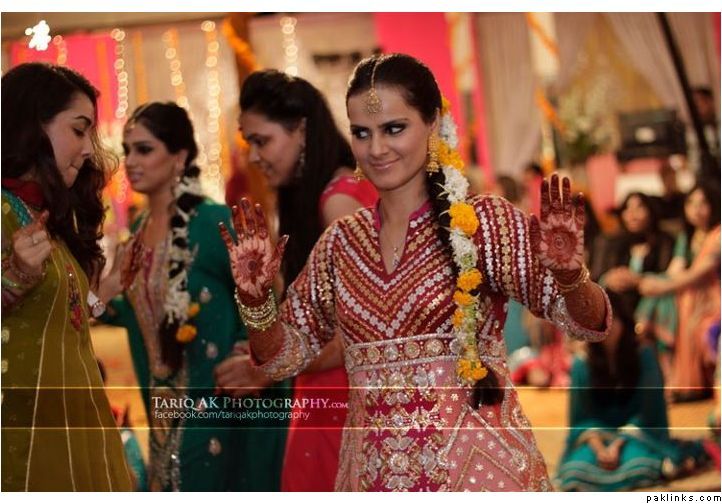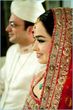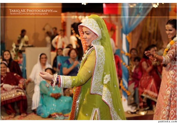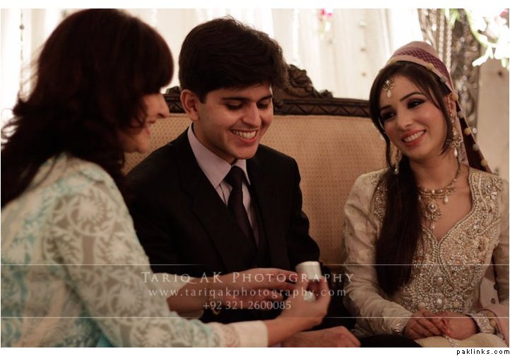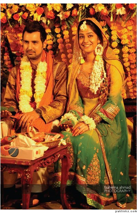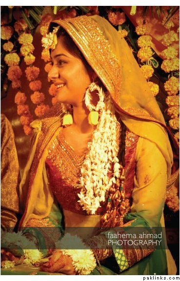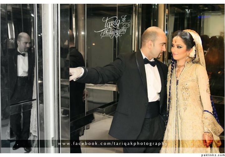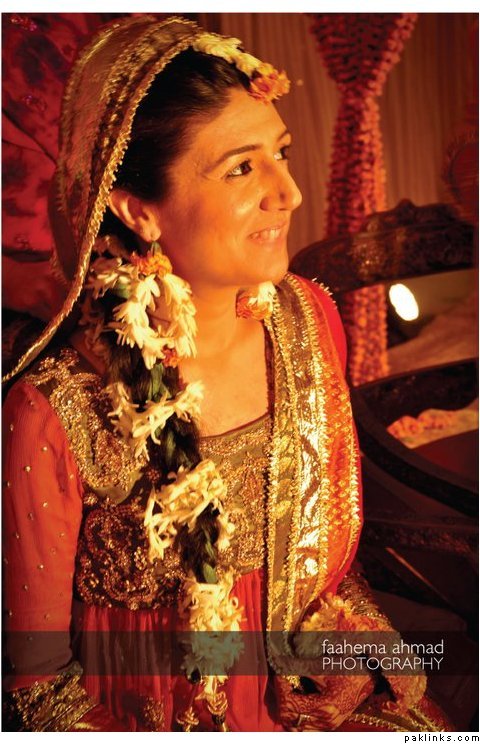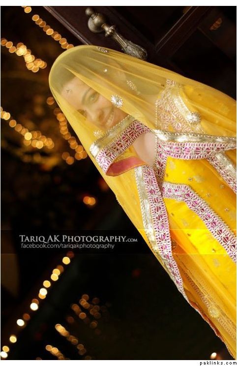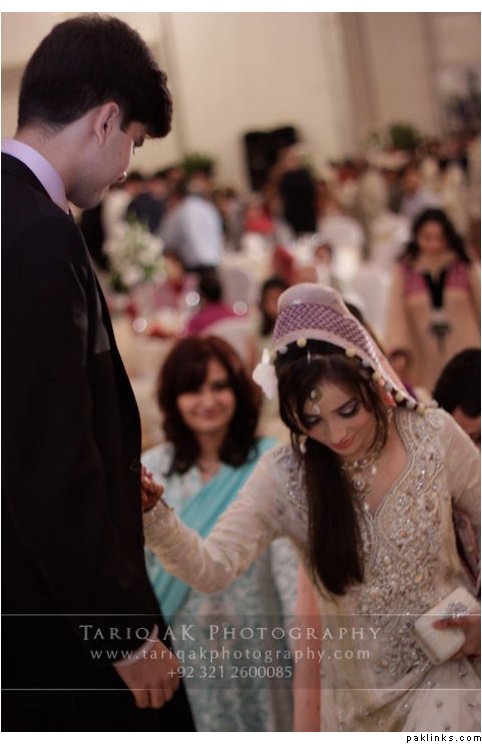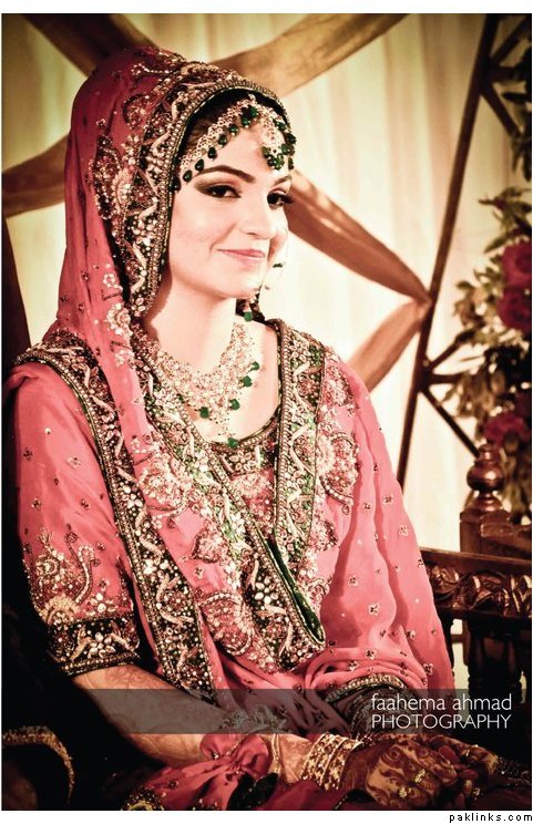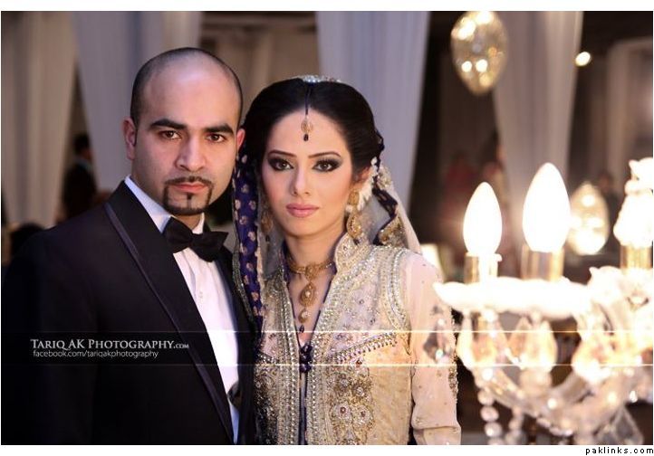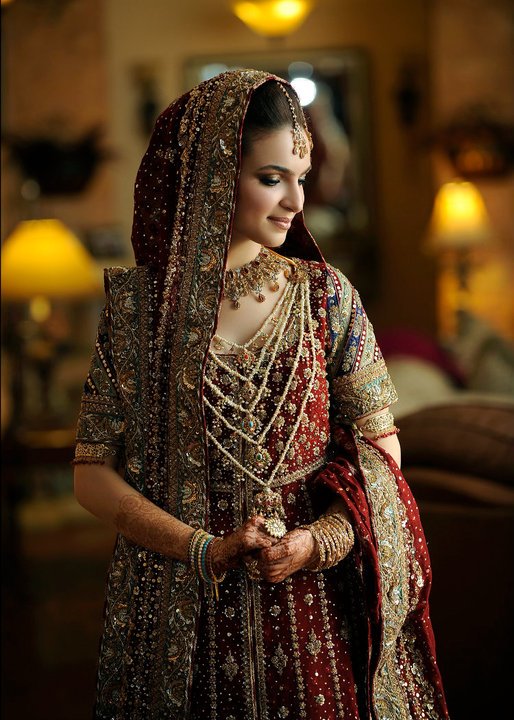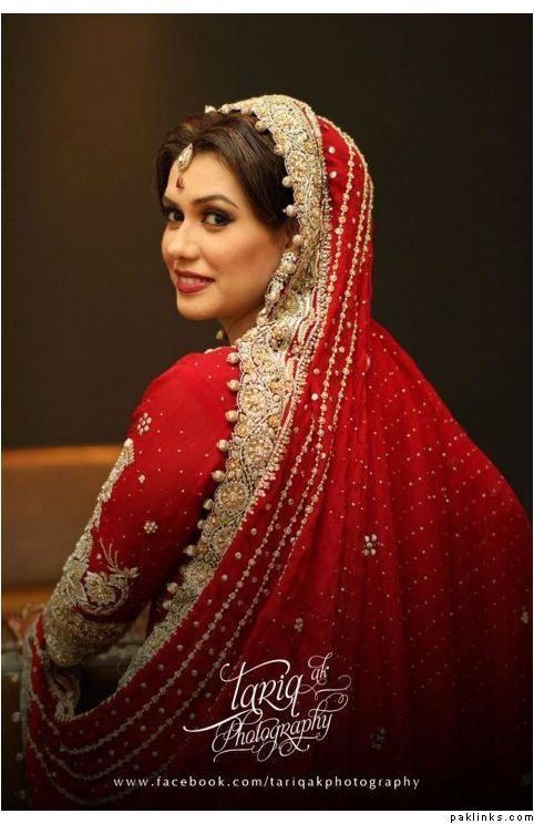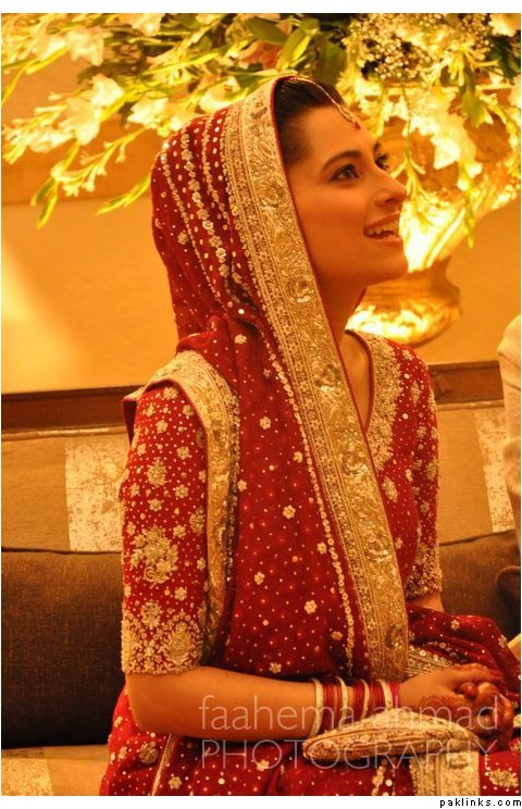 Hehehe - good spot I Queue. I played a game of spot the difference and found one: the colour of the second shirt underneath the kameez is green in the sitting down picture and maroon in the real bride. Also, the real bride has a dark blue and cyan border, whereas the model has a dark blue and green border. Very beautiful dress though, I have to say - I love the neck detail thing. Who’s the designer?
