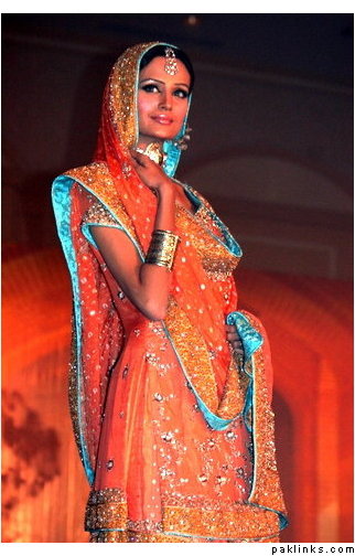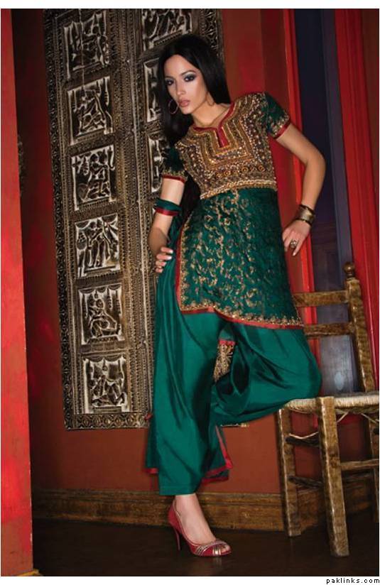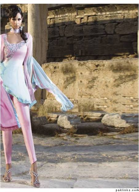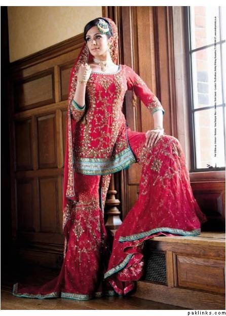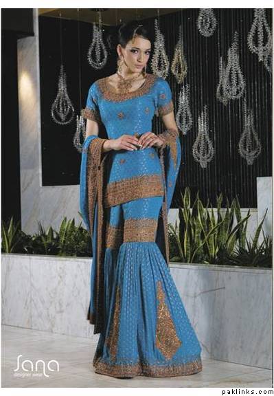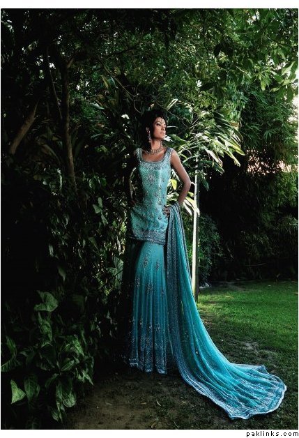 I think I have this one. Its turquise blue gharara and red shirts and the dupatta is red coordinated and turquise with light gold work.It was the in thing for 2008 .bt I have seen it on so many now, its deep and dark for the winter 2008.makeup and colours.
