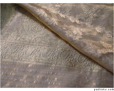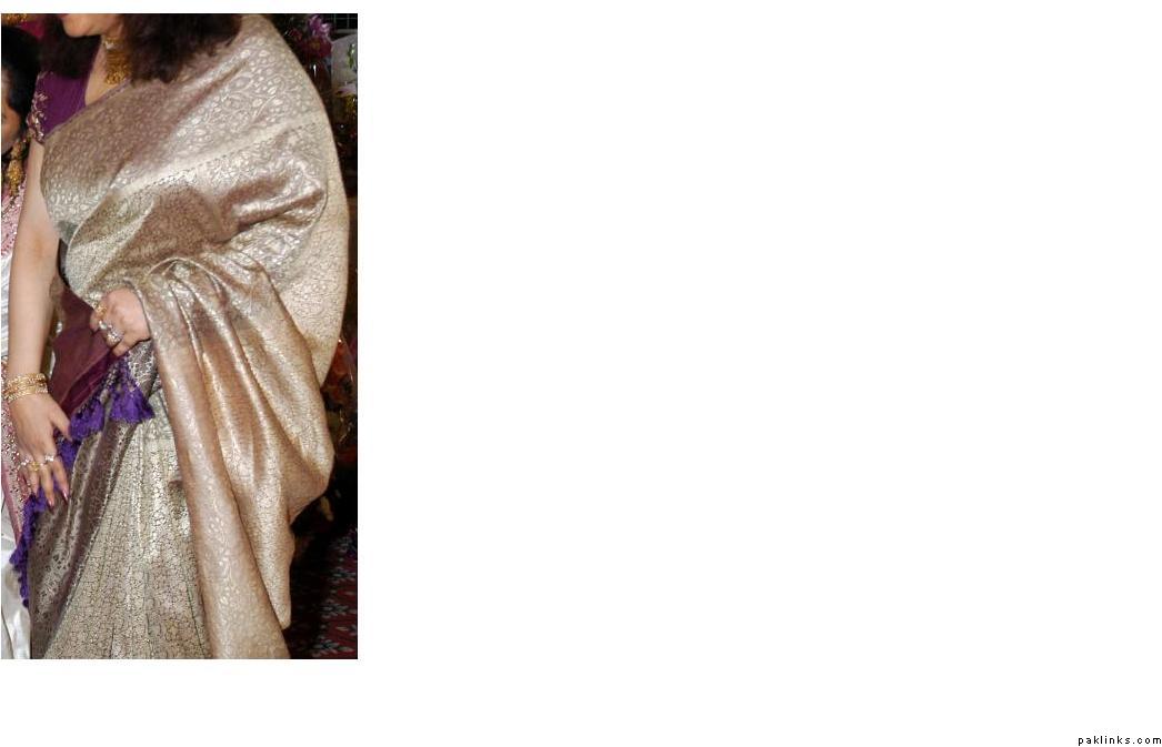 My naanijaan’s saree is also a dull gold color, but its in banarsi tissue with heavy jaal work in gold zari accented with touches of maroon and green resham work. I don’t have pictures, but its similar to this saree, but with the colored resham accents: