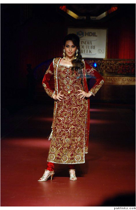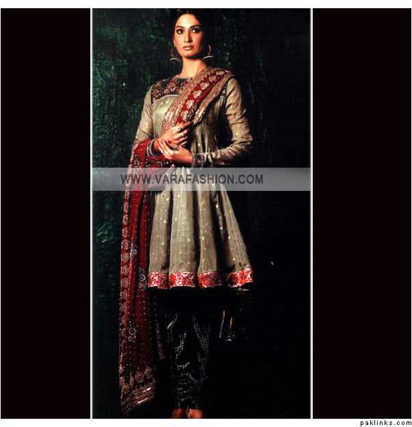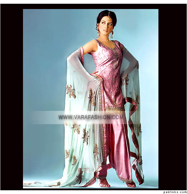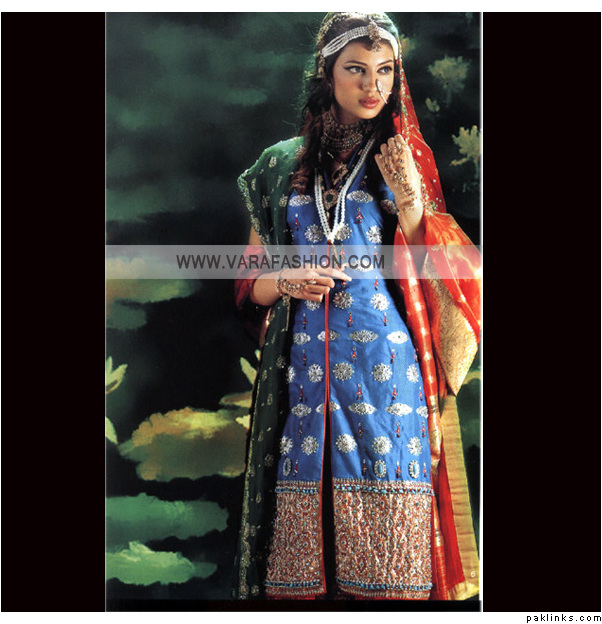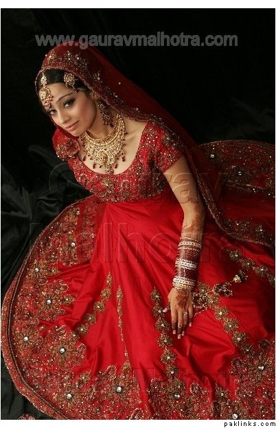 Personally, I am not a fan of bridal outfits with shalwars, Patialas are out of the question, too. Churidars/Fitted trousers, Anarkalis, Angarkhas and the Hyderabadi Khara Dupatta are much more suited for the bride rather than the shalwar. I found a few pics to give you an idea.