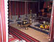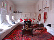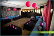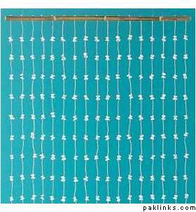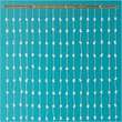 On one side of the room, create a photobooth with a background aqua bedsheet and clear beaded curtains.
