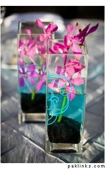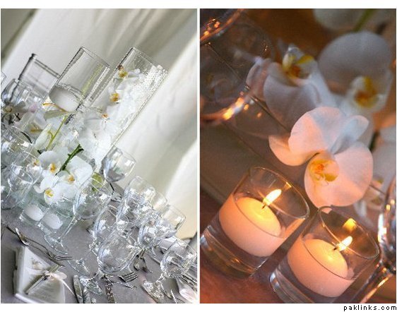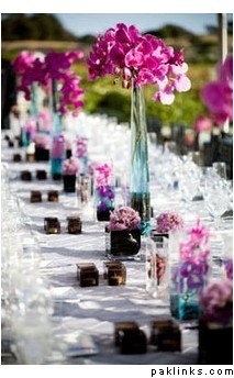 if orchids are too pricey in pakistan (although they should be cheaper cos they're mostly shipped from thailand - at least for canada - and thailand is way closer to pakistan than canada!), you can always take the concept and sub in other flowers - i think submerged bouganvillea's would look gorgeous and they have the rich ruby color too- i remember that bloom being really common in karachi. and of course, theres always roses too. try varying the heights of the vases too if you're going to have round tables - that way, you might get away with two small-ish ones and only one tall one.
