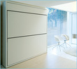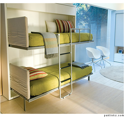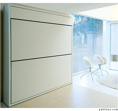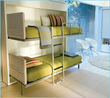 The Lollipop IN Space Saving System is a wall bunk bed system that includes a completely integrated ladder which also functions as a bed support, a safety rail for the top bunk and a storage shelf above the top bunk. This system is also available with an optional fold-out desk mounted to the front of the lower bunk and optional folding headboards.