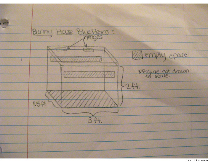 Now I have to build a bunny house before I get the bunny because my parents don’t want me to keep it in the garage because it will smell bad. So, I’ve designed a small box with an open bottom that I will keep outside next to the house for my bunny to sleep in overnight. The top of the house opens so I can easily put her in there or take her out, and I made small openings for ventilation =].