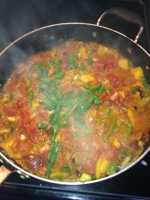 I sauteed some red onions, then I put some ginger garlic paste in it and fried for a bit. then I sauteed some green, red, yellow bell peppers in the pan then made a paste of spices in water and fried in the pan, Chilli, turmeric, zeera powder and a bit of garam masala. My kids dont like curry smell so I dont use dhaniya powder. When the spices get fragrant I added a can of stewed tomatoes. Once the stewed tomatoes separate oil I blended the sauce.