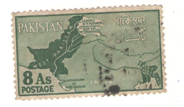 The disputed territory of Jammu and Kashmir was the subject of new definitive series. Four values were released projecting map of Pakistan, the State of Jammu & Kashmir and part of India Two small states Junagarh and Manavadar were also located on the map. The area of Jammu & Kashmir region is shown colourless with inscription "JAMMU & KASHMIR (Final Status Not Yet Determined)". Other elements of the stamps included country name in English at left top, and in Bengali and Urdu at right. The denominations of the four stamps are; 6 paisa (purple), 2 anna (brown red), 8 anna (green) and Rupee 1 (blue), are shown at bottom left below the map. Locally recessed stamps were used as definitives. Later some values were overprinted SERVICE for official use and the Re.1 value is also known printed on the gum side.