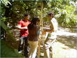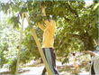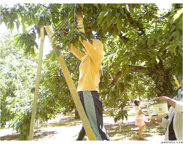 cousins and friend gathered around a ladder, debating whose gonna go up and pick, and who will stay on ground, holding the boxes.