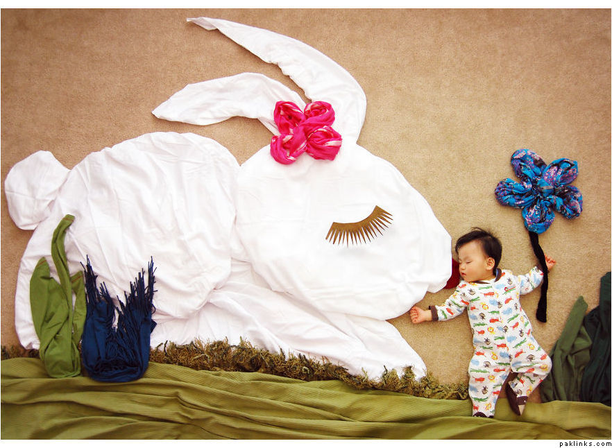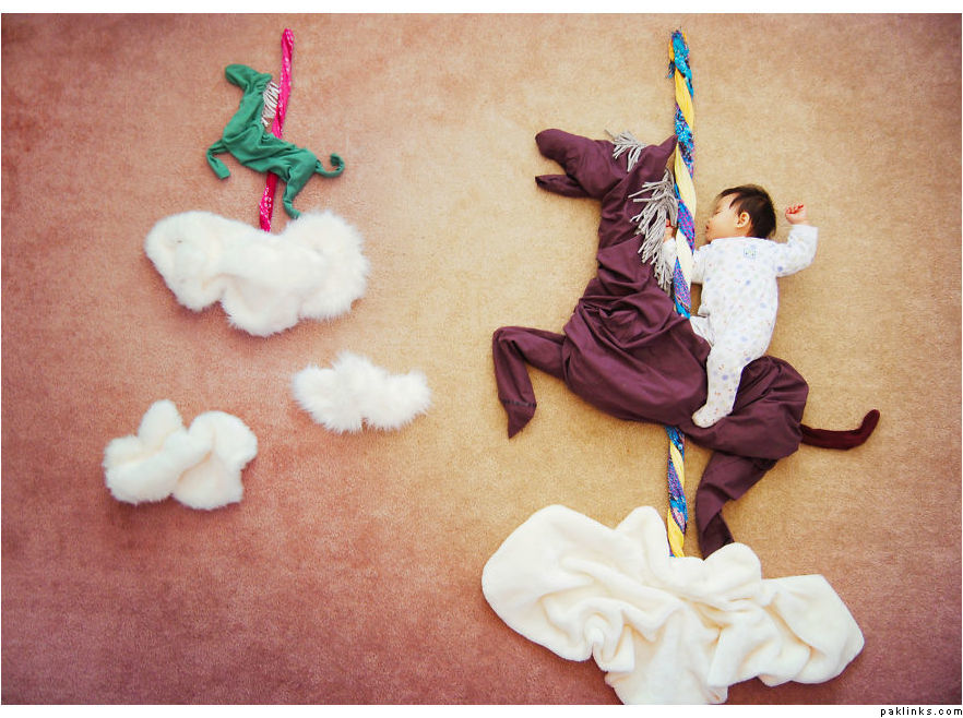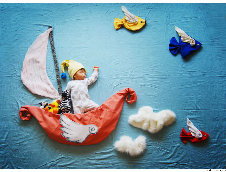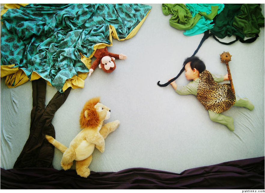 Do babies dream when they sleep, or they simply rest peacefully? Queenie Liao, a free-lance artist and mother of three boys living in California, has tried to answer this question by sharing the adventurous dramas that her child Wengenn dreams of during his sleep.Combining artistry and imagination with photography, Queenie has created captivating photos using plain cloths, stuffed animals, and other common household materials to create the background setting.Her album – Wengenn in Wonderland – is a compilation of over 100 creative photos that depict the continuous exploration of her son Wengenn in his magical land of charm and wonder. She drew inspiration from other creative mommas like Adele Enersen and Anne Geddes but gave the images her own imaginative fairytale twist.