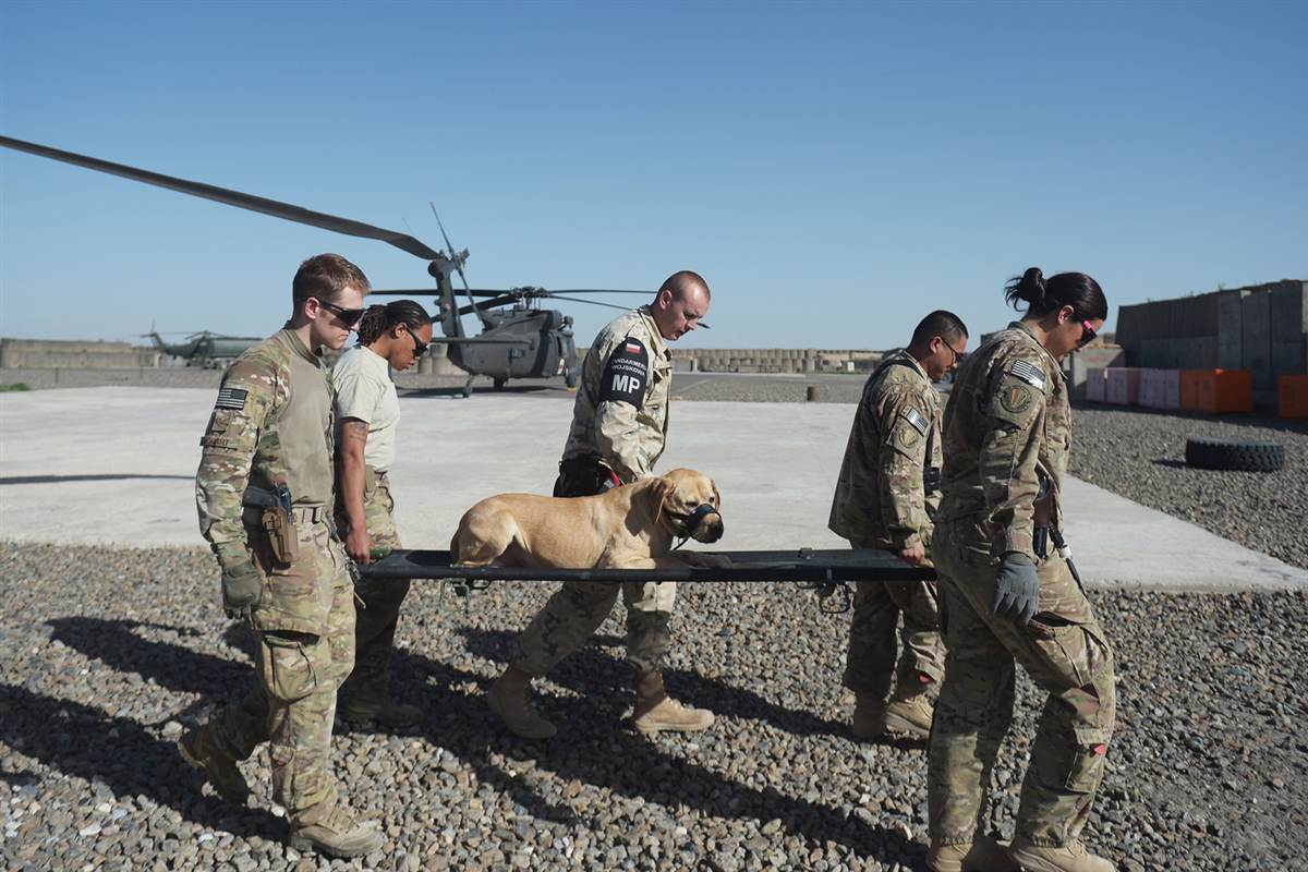U.S. soldiers from the 10th Combat Aviation Brigade and a Polish soldier, center, carry a dog on a stretcher from a UH-60 Black Hawk medevac helicopter during a training drill at Forward Operating Base Ghazni on May 17.