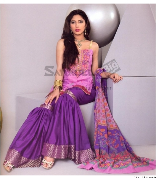 The new designers also put up collection where lawns are styled as casual ghararas for example this Wardah Saleem outfit from her 2011 lawn collection.