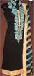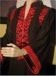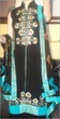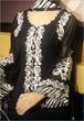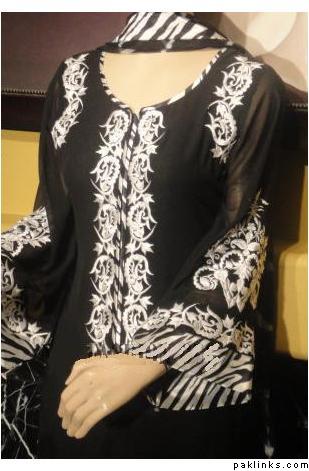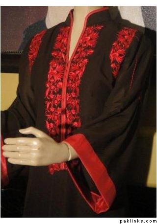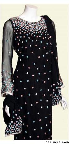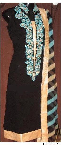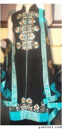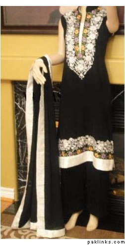 Fabric: Pure plain chiffon and silk jamawar. Color: Black and multi colored stripesWork: Kora thread and beads work.Shirt/Kameez: Its a short puff sleeveless with neck collar frock with work on neck line till waist line and has small motifs all around frock. Its is finished with three different colors jamawar stripes on bottom.Trouser/Shalwar: It has has flappers style trouser with gold edging all around hem.( can be replaced with shalwar simple straight trouser).Dupetta: Plain black chiffon duppata with gold piping all around.