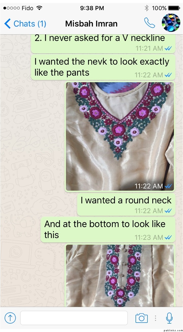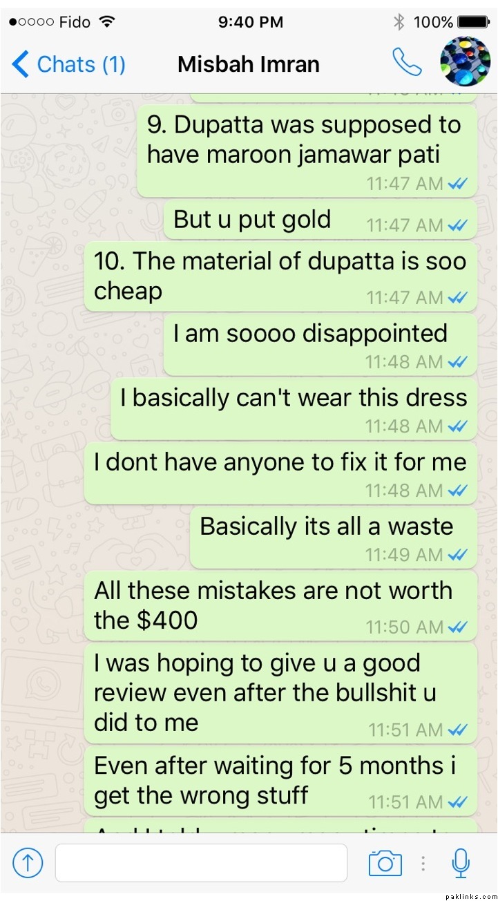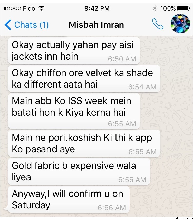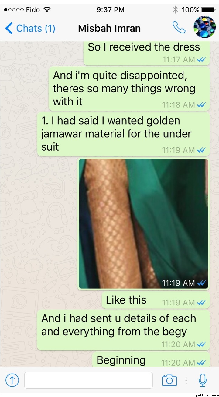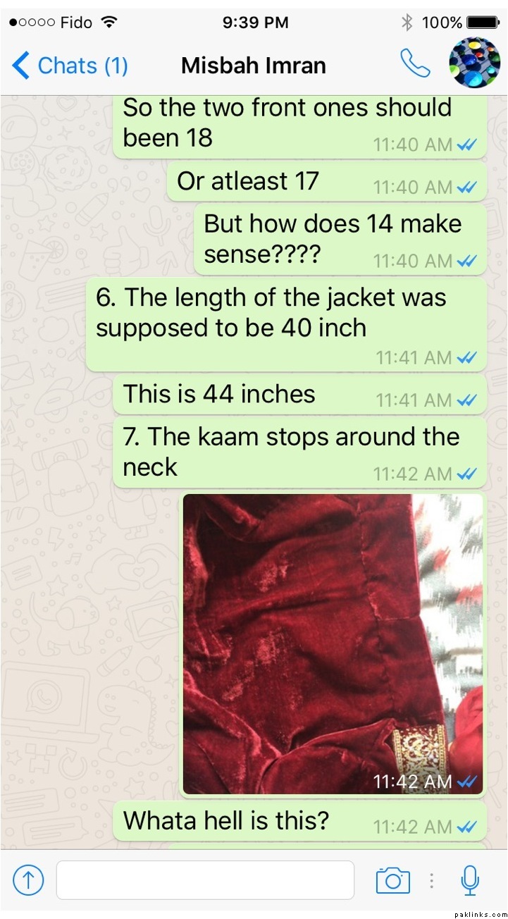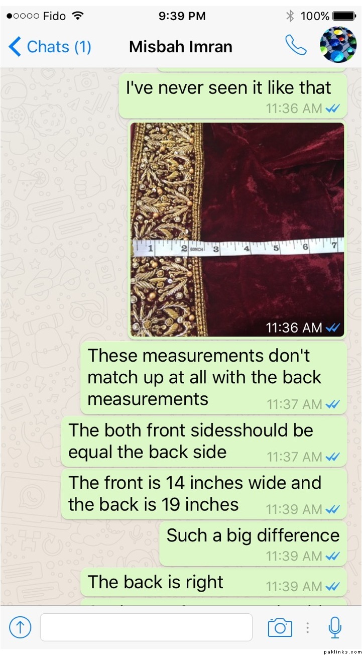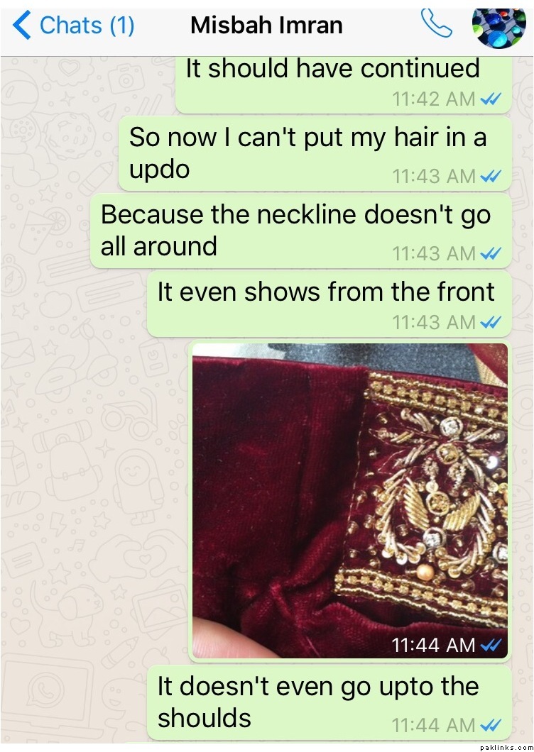 I had received the dress end December 12th and there are too many mistakes with it even after explaining every detail how I wanted and plus it was super late as I had placed the order in July and Misbah had promised to have the dress ready by sept 3rd.