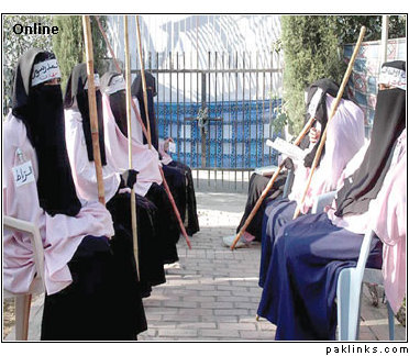 Women students in black burqas stood on the roof of their madrasa listening to the sermon, while young men carrying sticks, their faces covered by scarfs, guarded the mosque, searching people coming through its gates.