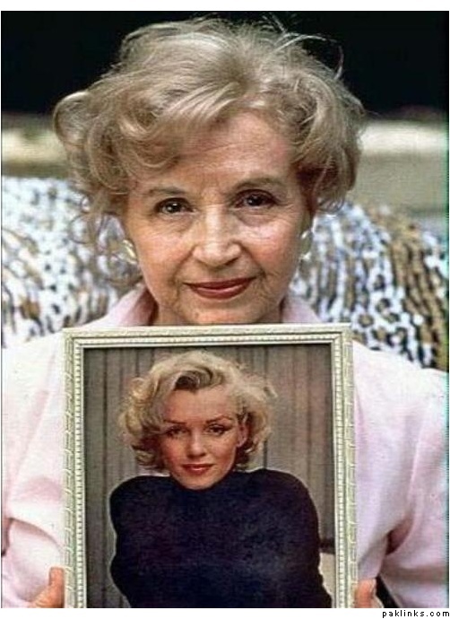Marilyn’s half sister Berniece Miracle holding a photograph of Marilyn. Berniece is the closest relative to Marilyn that is still alive today. Many fans find her fascinating, given the fact that she gives us an insight into what Marilyn may have looked like had she lived into old age![]()