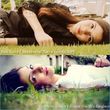 Laying on grass.