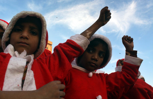 Pakistani minority Christians, some dressed as Santa Claus, participate in a Christmas peace rally in solidarity of the victims of the Peshawar school massacre in Karachi on December 21, 2014.