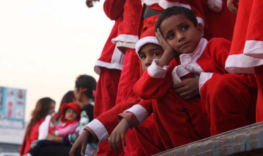 Pakistani minority Christian children dressed as Santa Claus pose during a Christmas peace rally in solidarity of the victims of the Peshawar school massacre, in Karachi on December 21, 2014.