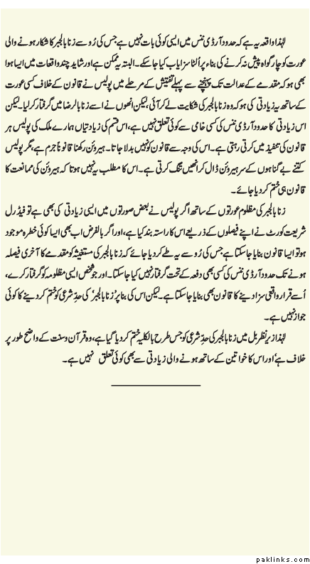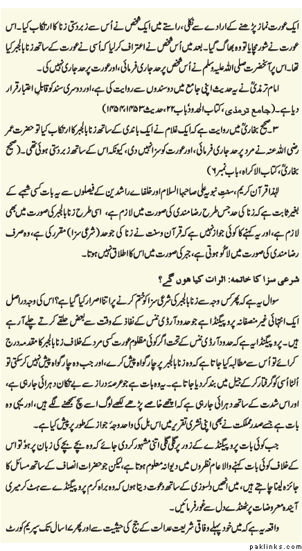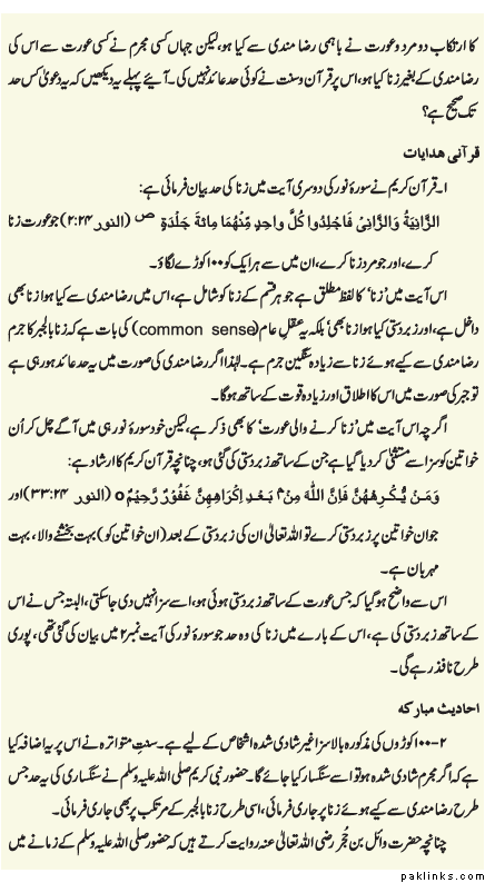 In a nut shell i mean to say that do not punish the people wo commit adultery without 4 witness but if you include rape into hudd we have to find 4 witness which will never be there so rapsit will go free. i have posted my link just to analyze and show that exactly this is the reason Quran has not included rape in Hudd. Now if you say zana includes rape and adultery by adding pre-fix bil jabbar & bil raza. this was never understood like this at the prophet’s time and the two incidents quoted by our learned scholar are simply wrong guidance to readers. i have shown how he has avoided giving the arabic text here and gave the text the other place.