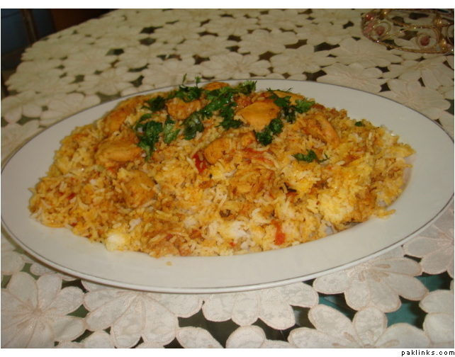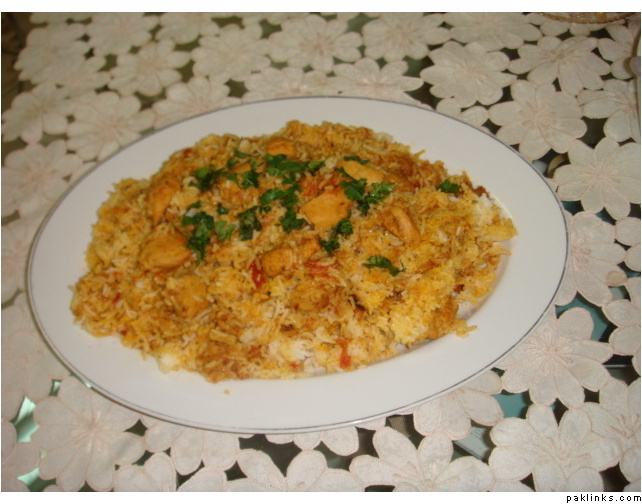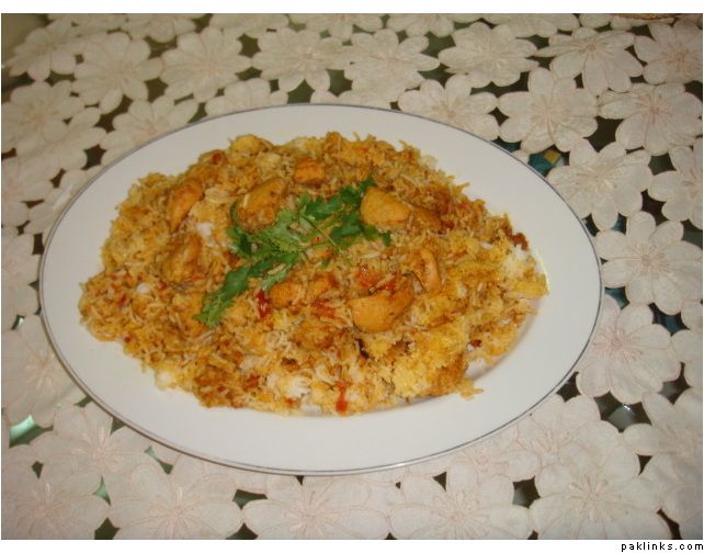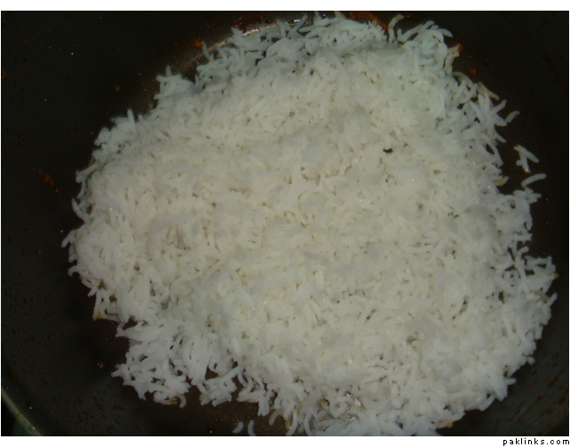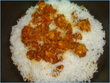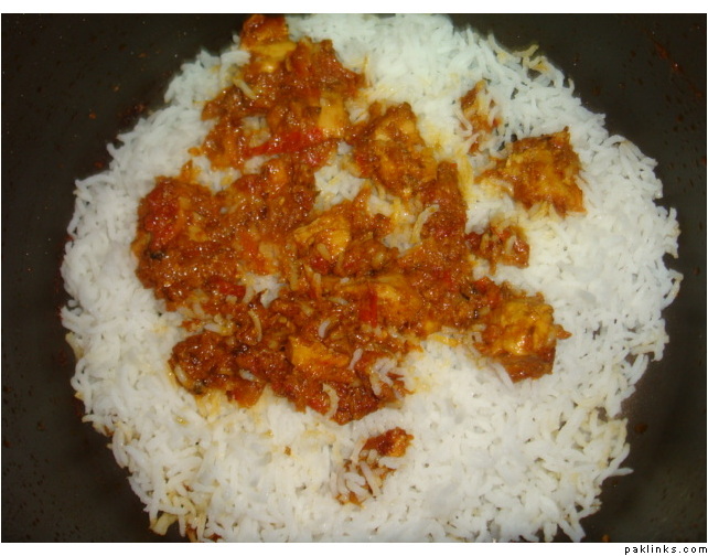 make layerings of rice n chicken curry in succession in a large pot and cover n cook on low heat for about 10-12 min.