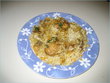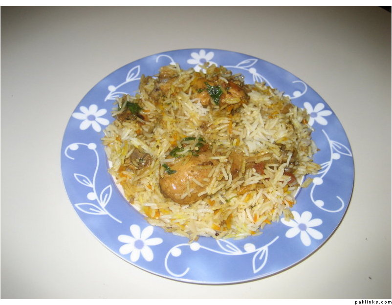 Return half of them back to the pot.Layer with the chicken salan and some chopped up green chillies and fresh cilantro.Put the rest of the rice over the layer of the chicken.Add some olive oil and yellow food color on teh top layer and put on dum .I usually do a dum for 15-20 mins,but it can vary.