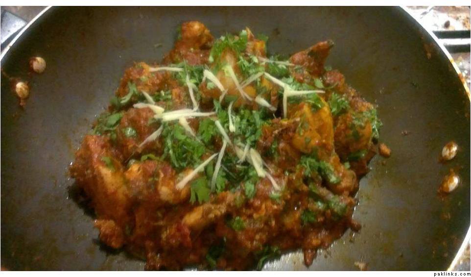Heat some oil in a pan.Add ginger and garlic to it and fry it for a bit.When fragrant,add the washed and drained chicken pieces alongwith the regular spices (salt/red chillies/zeera/haldi/cinnamon stick).Flip the pieces and cook for a few mins…when it changes color (like in ten minutes),add chopped tomatoes (I usually use 4-5 for 1 whole chicken)…flip everything again and cook for a few more mins.then cover and let cook for a while till you think it will be done.Garnish with julienne ginger,chopped green chillies and cilantro.Serve.