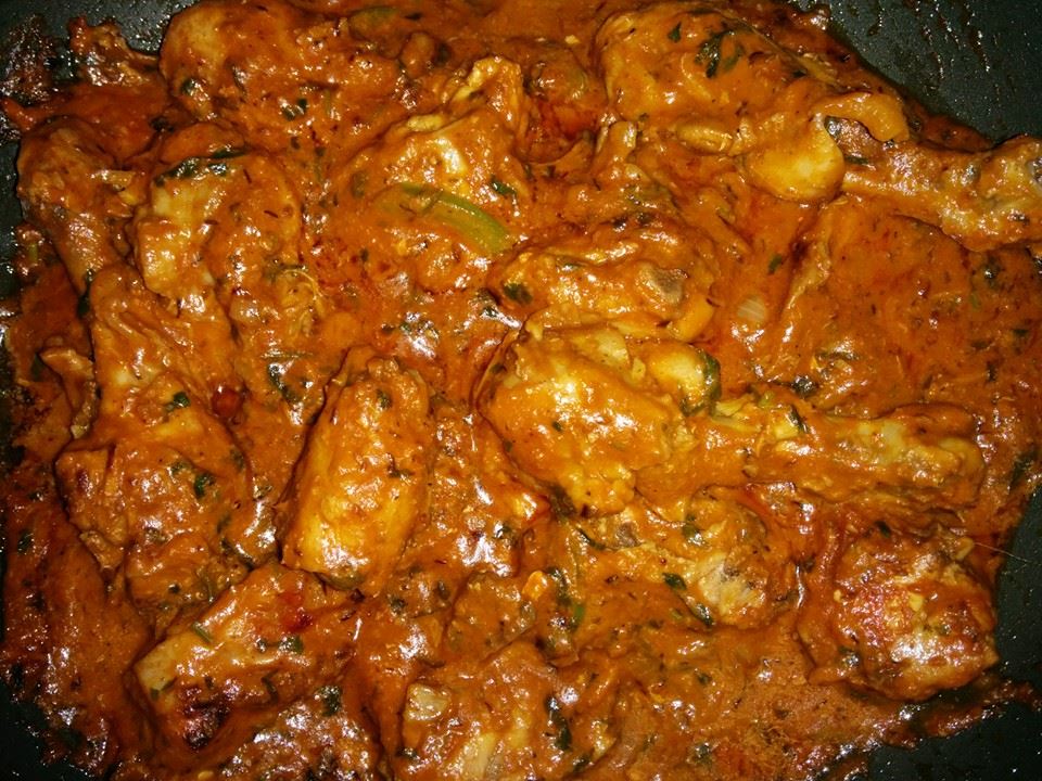 Let’s see, fry some ginger garlic paste, add chicken fry a bit, add lots of tomatoes and cover to let soften. Add salt, crushed chilli flakes and red chilli powder to taste, cook a bit, whip a bowl of yoghurt add, simmer on high heat, cover and let cook on low heat. At the end add a few green chillies, chopped corriander and julienned ginger, swirl around a bit and cover. Boneless chicken can be used too.