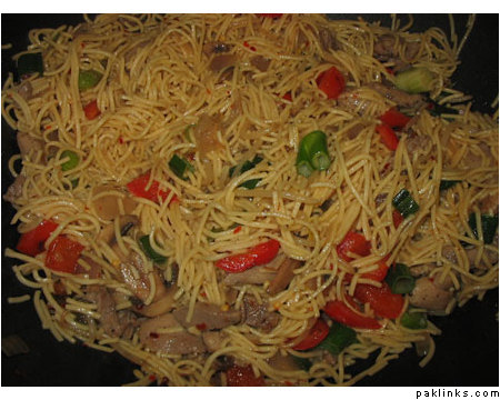 Heat a wok or frying pan over medium-high to high heat. Add 2 tablespoons oil. When the oil is hot, add the noodles. Fry in batches until golden. Remove the noodles from the pan.