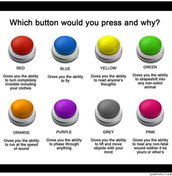 Though red sounds very tempting aswell, but I would go for Blue: the ability to fly. It can come in handy in many situations. I.e. fly away during fights and dangeous situations, avoid busy traffic, never be late again, always a shortcut to reach destinations, easily get in high trees and buildings. I could always leave my appartment window open and just fly in instead of having to use the elevator.