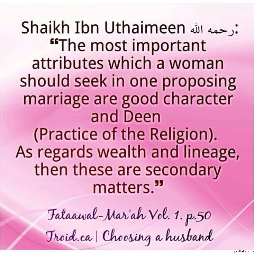 “If there comes to you to marry (your daughter) one who with whose religious commitment and character you are pleased, then marry (your daughter) to him, for if you do not do that, there will be fitnah (tribulation) in the land and widespread corruption.” Narrated by al-Tirmidhi