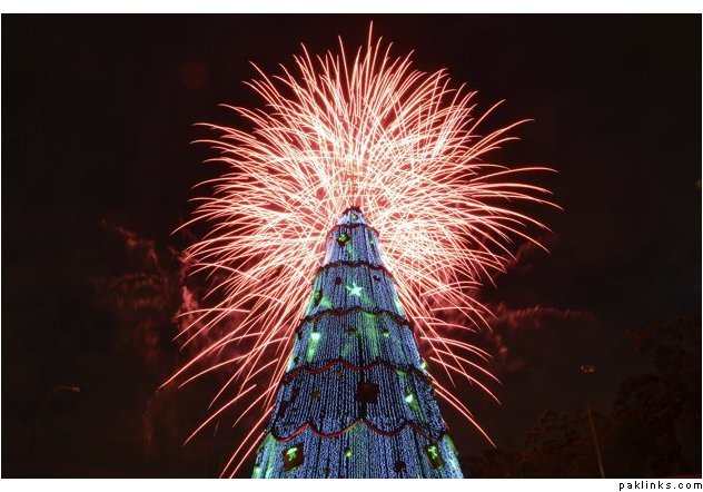 Show of fireworks at the opening of the large traditional Christmas tree in the city of Sao Paulo. The structure is almost 60 feet tall and has more than 500 lamps and 264 000 stroble micro-LED lamps on December 9, 2012
