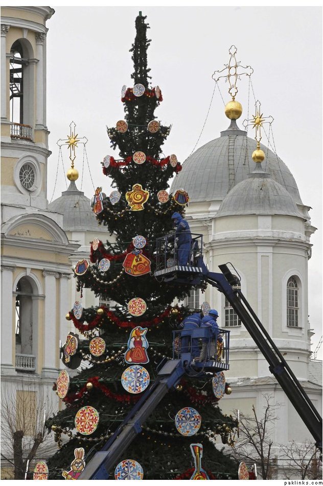 Municipal workers decorate a Christmas tree in front of St. Vladimir Cathedral in St. Petersburg November 28, 2012. Authorities plan to erect 68 trees in Russia’s second city to celebrate the festive period, only one of which will not be artificial, according to city officials.