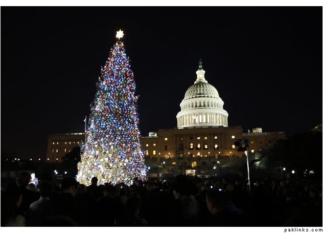 The U.S. Capitol Christmas Tree is pictured against a backdrop of the U.S. Capitol Building in Washington, December 4, 2012 during the official lighting ceremony for the tree