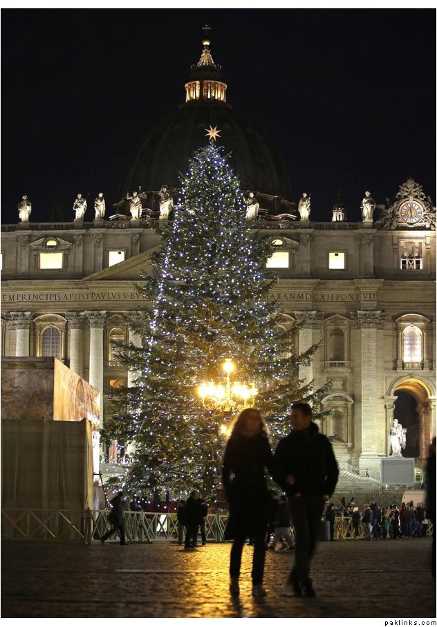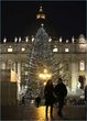 The Vatican Christmas tree is lit up after a ceremony as a couple walk in Saint Peter’s Square at the Vatican December 14, 2012